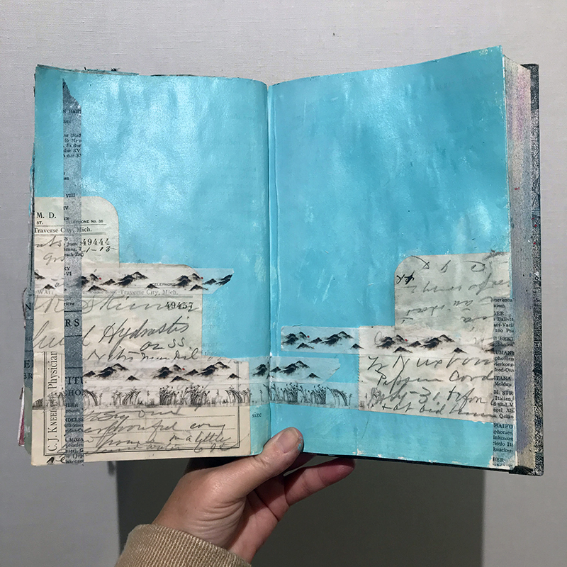 The first layers started out with PaperArtsy Fresco Finish Paints in Caribbean Sea and Mermaid painted onto both pages of an altered book. Some vintage prescriptions were glued down with a UHU glue stick and a few washi tapes with mountains and grasses glued down as well. A layer of clear gesso went down over everything.