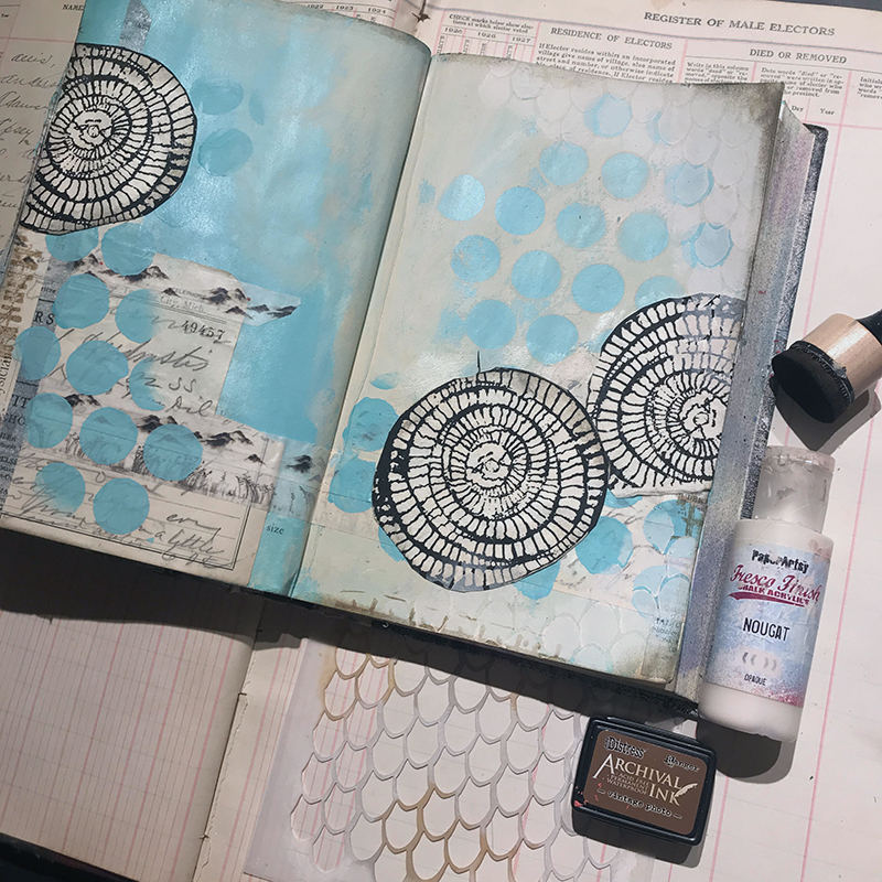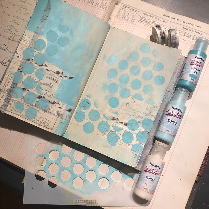 When dry, I painted the right page with PaperArtsy Eggshell paint and placed the Polka Dots Houndstooth stencil over the eggshell paint, and lifted the paint up through the stencil with a baby wipe to reveal the aqua circles. Next, I sponged PaperArtsy Caribbean Sea through the stencil on the left page over the papers to unify both pages. A few black and white collage elements were glued down as a base for my focal point.