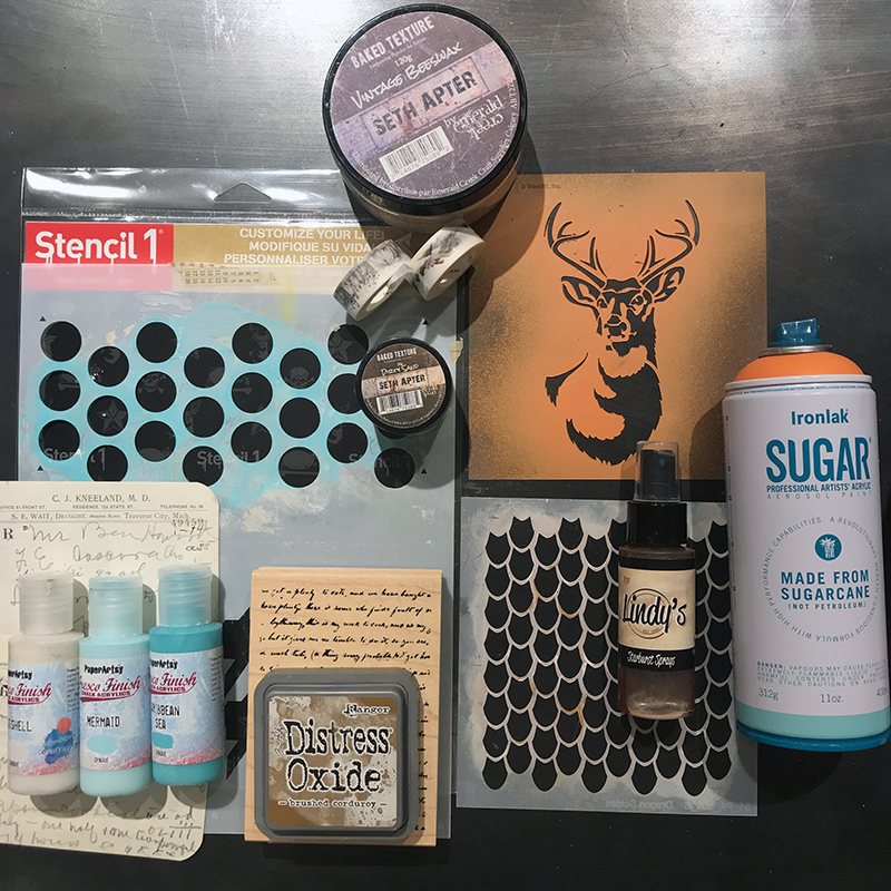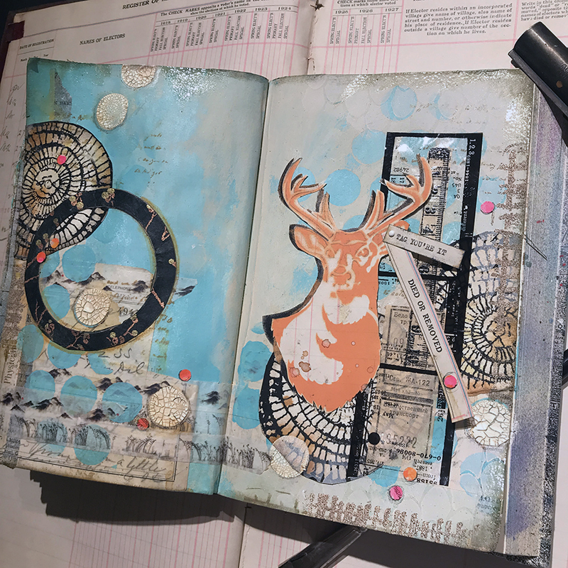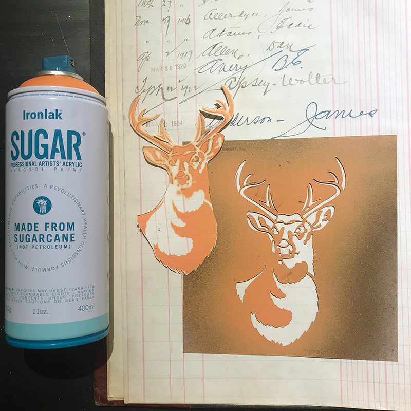 I used the Antlered Deer Stencil onto vintage ledger sheets and spray painted Ironlak Sugar Sprays in Black and Orange through the stencil twice. I cut out each deer and used the black one as a shadow behind the orange deer and offset them slightly gluing together.