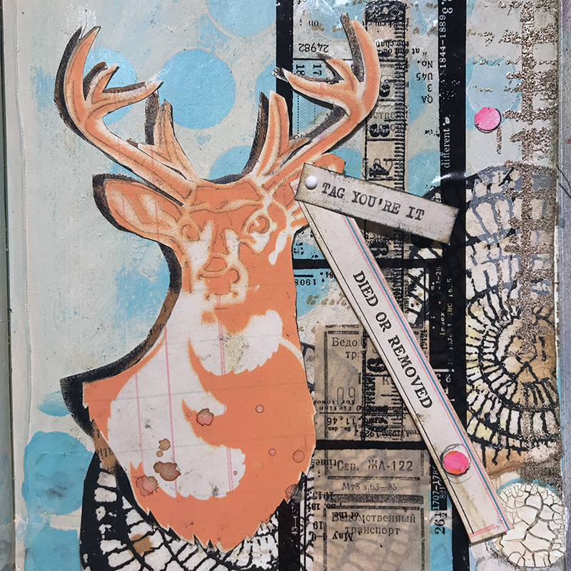 “Tag You’re It” was inspired by the Antlered Deer Stencil and the sadness I feel for these majestic animals during hunting season up here in northern Michigan.