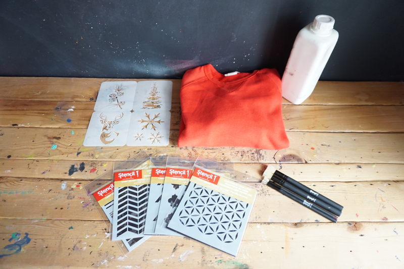 Things you will need: A plain pullover sweatshirt, white fabric paint, paint brushes, your favorite Stencil1 stencils, and Stencil1 Small Pattern stencils.