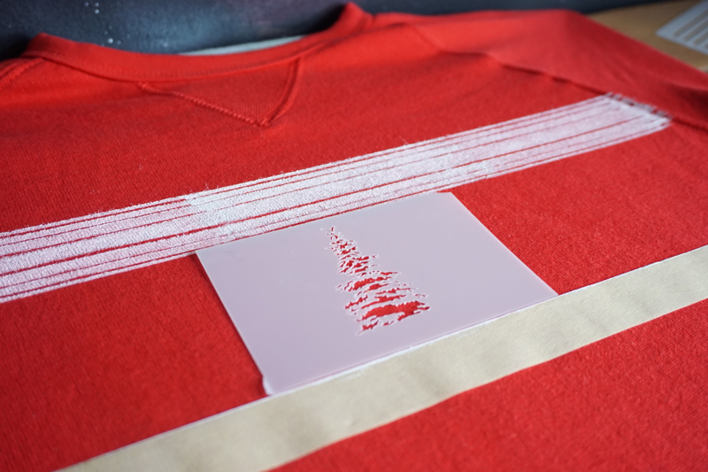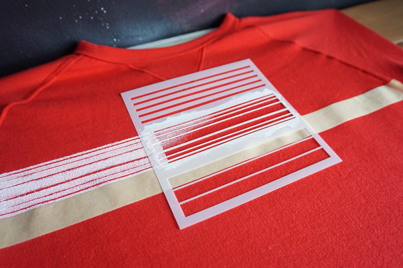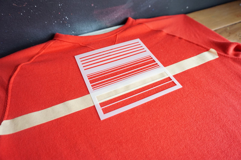Place your stencil on your desired location. Here, we started off with the Stripes Repeat Pattern stencil. (Tip: Place a long strip of masking tape across the width of your sweatshirt as a guide to align your stencils in a straight line.)