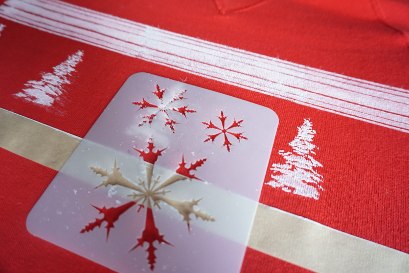 Step 6. Grab another stencil of your choice. To fill up the gaps between the Snowy Pine Trees, we used the small snowflake from the Snowflakes stencil, also from the Winter Holiday 4-Pack.