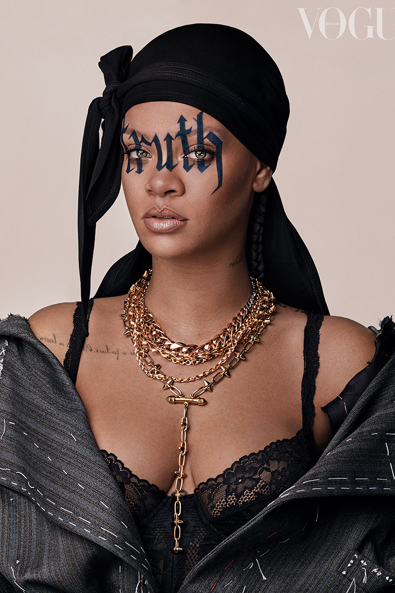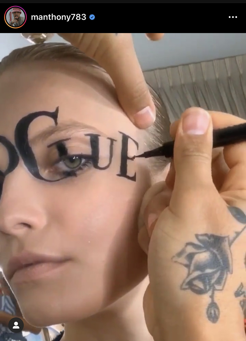 In present day, we are seeing a trend in face makeup, words written on the face. Words of expression, words simply as labels, words. Did it trend as face tattoos have become more popular in mainstream? Who knows but it’s cool. The biggest celebs are getting in on it, look at Rhianna on the cover of British Vogue.