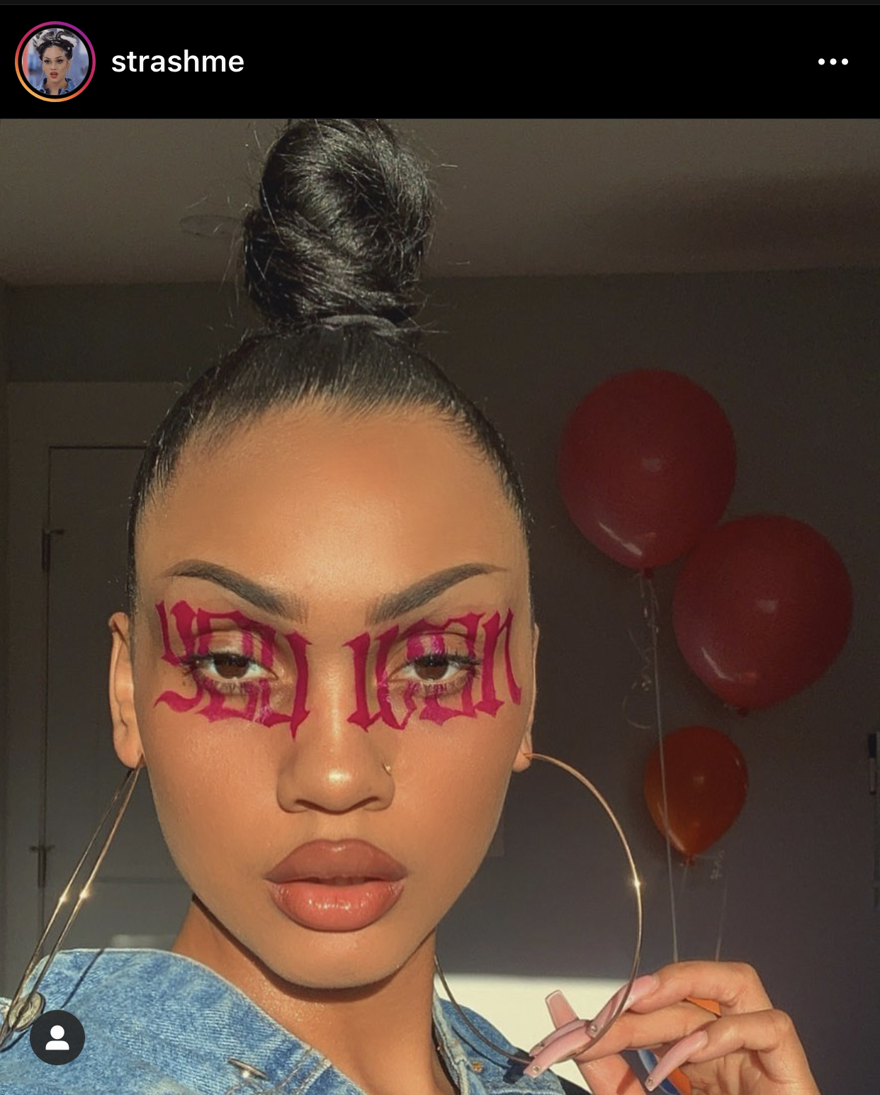 Ashley, aka Strashme created a look inspired by brand Off-White where she did a minimal labeling on her face. Free hand lettering ain’t easy!
