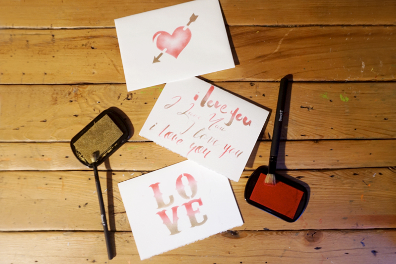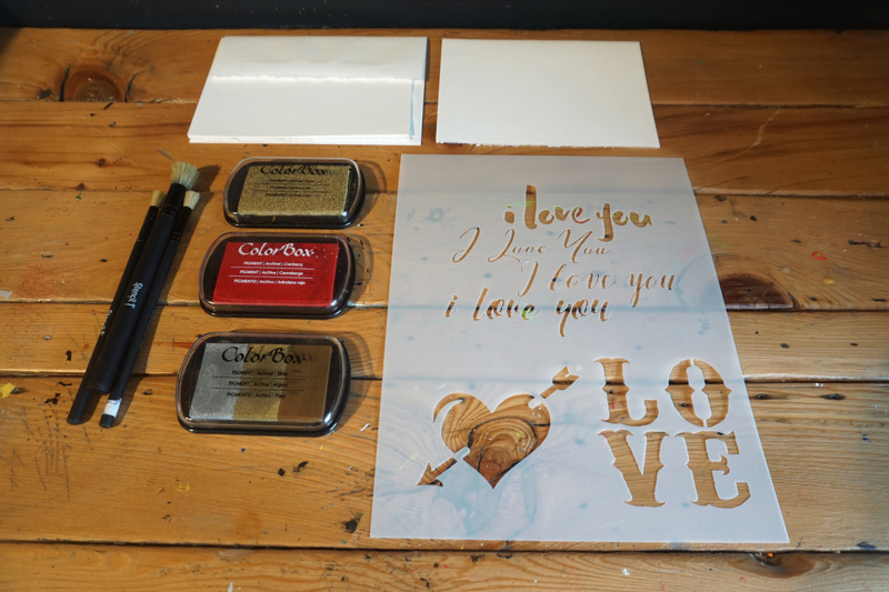 Things you will need: Blank cards and envelopes, ink pads, brushes, and the *NEW* Stencil1 Valentine’s Stencil 3-Pack