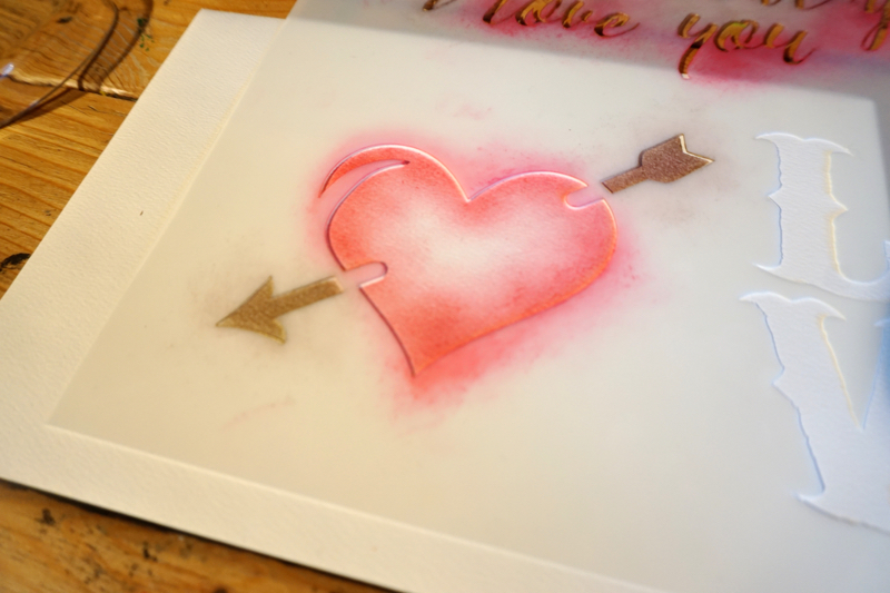 On the envelope, choose another stencil! Here, we used the heart and arrow stencil. Here, we left the center of the heart empty, and built the color towards the edges of the heart for an airbrushed look.