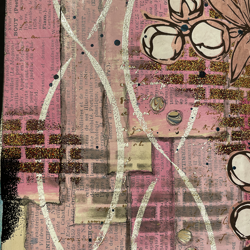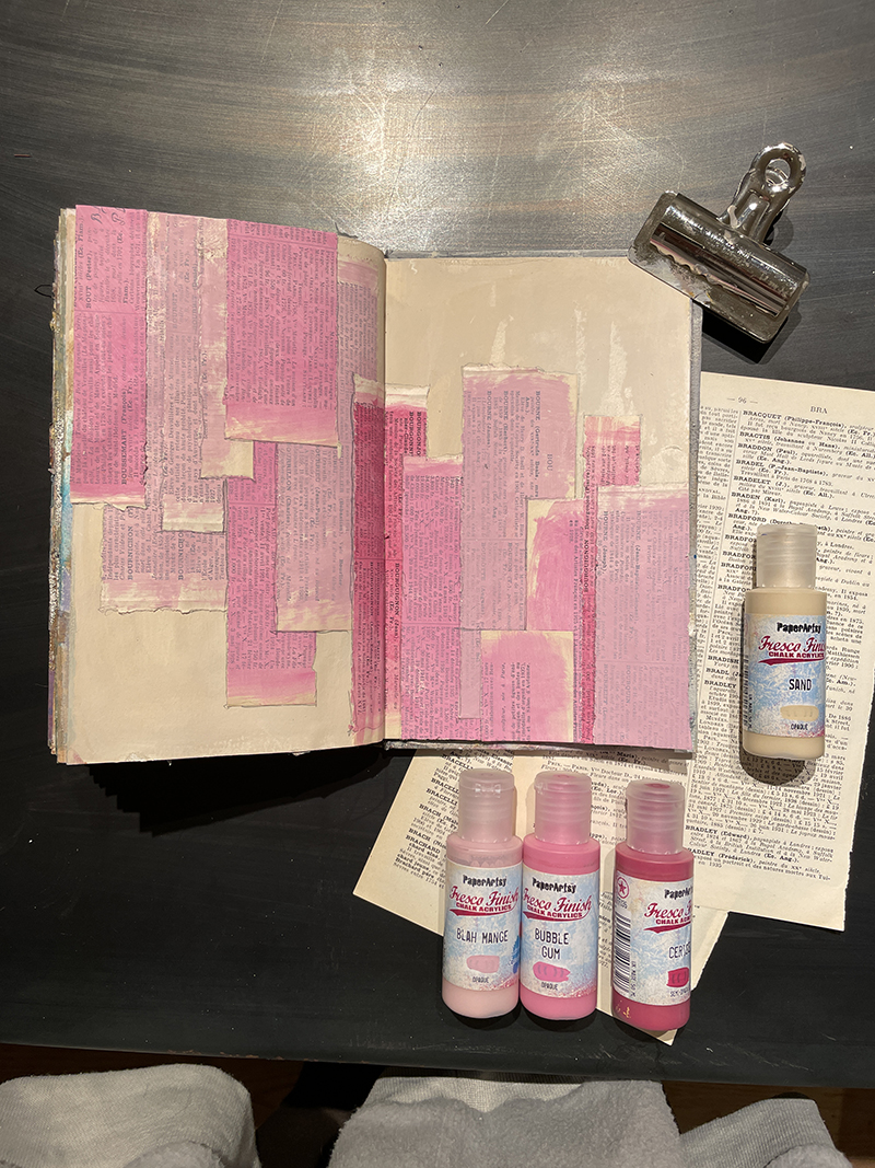 “Hitched” is a journal entry inspired by a prompt “pink” in the #creative6daychallenge. I painted two adjoining pages in a Stillman and Birn journal with PaperArtsy Sand mixed with a little White Gesso. I next painted a few vintage dictionary pages in PaperArtsy Blah Mange, Bubble Gum, and Cerise. I ripped these into strips and glued them down with a UHU glue stick in a shingle-like format.