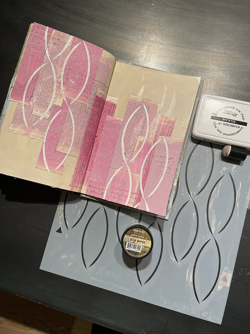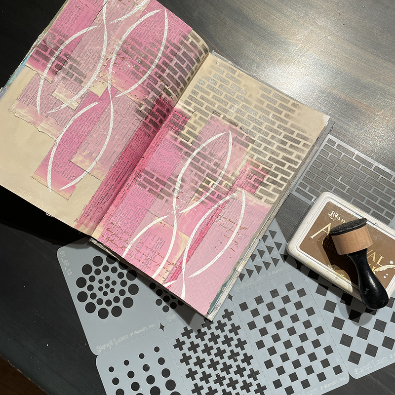 This brick pattern stencil from the Patterns #2 Stencil 8 Pack was next calling my name and used it by sponging Brown Archival ink through in random spots. I heat set and then replaced the stencil back over the pattern and sponged on clear embossing ink in spots and used Taos Sunset Baked Texture Powder to add that real brick texture.