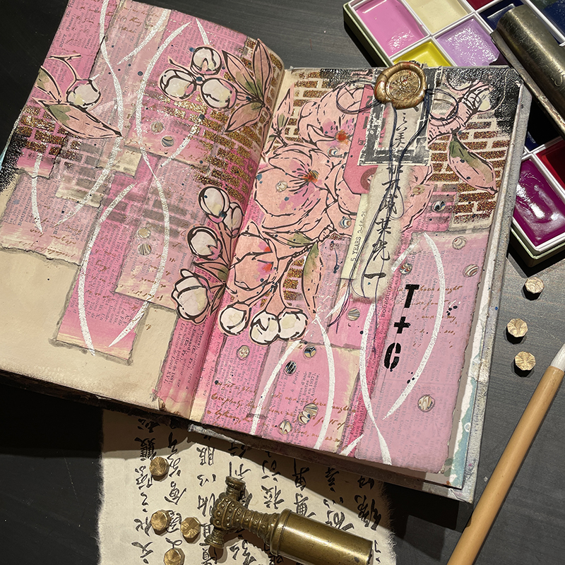 I also outlined the individual pink shingles with Shading Gray Fluid acrylic ink from Golden to shadow. I next watered down some Inky Pool PaperArtsy paint and splattered over the bricks and cherry blossoms (covering the collage elements to protect). Using custom gold marbled wax, and the stamper, I took the Japanese calligraphy and stamped it with the string right below it. The string was tied into a neat little bow.