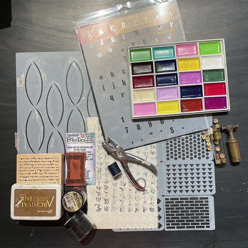 - Baked Texture Powder from Seth Apter, White Cloud, Eclipse, and Taos Sunset (or other embossing powders)