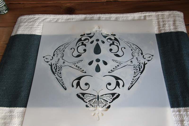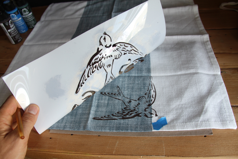 Step 6: Now that your placemats are ready, it’s time to make matching napkins! We placed the stencil so that the sparrow is at the bottom of the blue stripe, slightly overlapping into the white area.