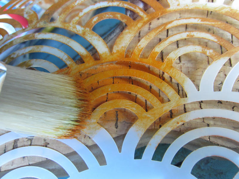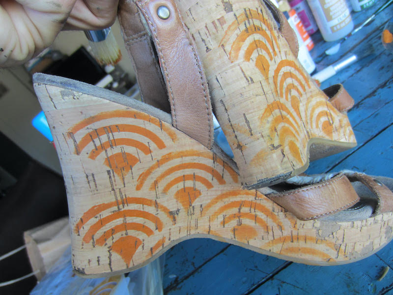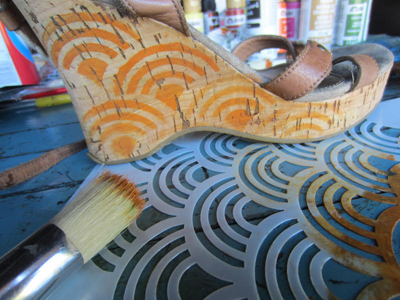 When I recently attended the ALT Summit held at Martha Stewart’s HQ, I noticed that many of the blogger gals there had on high wedges. Some were even decorated or painted. Well, I can do that too! I had to try it out. I got these cork wedge heels at Amarcord, a vintage store in Williamsburg Brooklyn for a few bucks. I thought my Scallop Repeat Pattern Stencil would be perfect in a burnt orange for summer. I just held the stencil in place, filled in the design with a VERY DRY BRUSH, and there you have it. These say fun, do you agree?